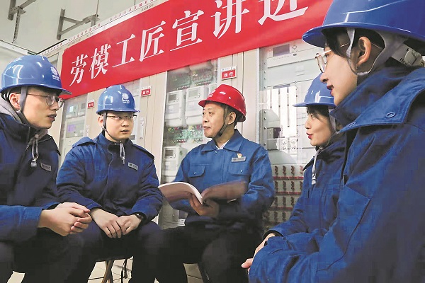 近来,山东省日照市总工会成立由劳模、工匠和高技能人才组成的“小马扎劳模工匠宣讲团”,向一线职工宣讲十九届六中全会精神,以自身成长经历诠释劳模精神、劳动精神、工匠精神。图为全国劳模贾廷波在莒县文心变电站与职工学习交流。本报记者 田国垒 本报通讯员 蒋月阳 汤博洋 摄