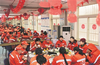 春节临近,庐阳区部分家在外地的环卫工人选择就地过年。1月24日中午,庐阳区城管局邀请40余名留守过年的环卫工人一起吃团圆饭,让他们在异乡也能感受年味。新华社记者 周牧 摄