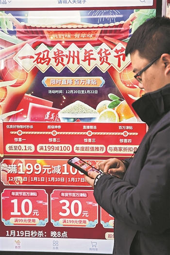1月18日,工作人员通过手机浏览“一码贵州”年货节页面。春节临近,“一码贵州”线上年货节正在举行,柴火腊肉、桐梓方竹笋、阳朗辣子鸡等特产受到消费者青睐。新华社记者 欧东衢 摄