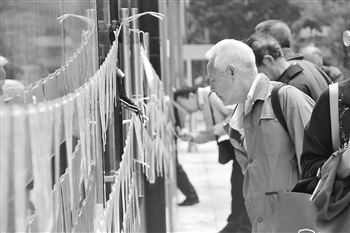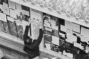 重庆洪崖洞的老年相亲角,一位老人在贴“寻伴”信息。视觉中国供图