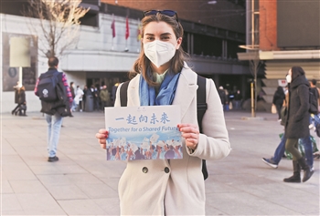 1月18日,在西班牙马德里,青年阿利娜手举“一起向未来”的主题口号,祝福北京冬奥会。新华社记者 孟鼎博 摄