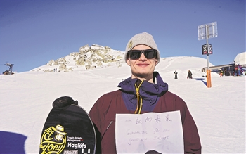 1月14日,在瑞士拉克斯,瑞士单板滑雪运动员约纳斯·伯西格尔手举“一起向未来”的主题口号,祝福北京冬奥会。约纳斯·伯西格尔将参加北京冬奥会自由式滑雪坡面障碍技巧和大跳台两个项目的比赛。新华社记者 肖亚卓 摄