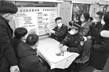 1月24日,在济南开往广州的T179次列车上,列车长与乘警共同为旅客讲解春运期间购票乘车中的诈骗陷阱,以帮助旅客守护好自己的“钱袋子”。