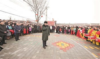 村文化广场上十分热闹,村民们打起威风锣鼓、扭起秧歌欢庆佳节。看到总书记来了,人们高兴地欢呼起来。习近平对乡亲们说,我们党的根本宗旨就是为人民群众办好事,为人民群众幸福生活拼搏、奉献、服务。我们如期打赢了脱贫攻坚战,如期实现了全面建成小康社会目标,现在踏上了全面建设社会主义现代化国家新征程。建设现代化国家离不开农业农村现代化,要继续巩固脱贫攻坚成果,扎实推进乡村振兴,让群众生活更上一层楼,在推进农业农村现代化中越走越有奔头。