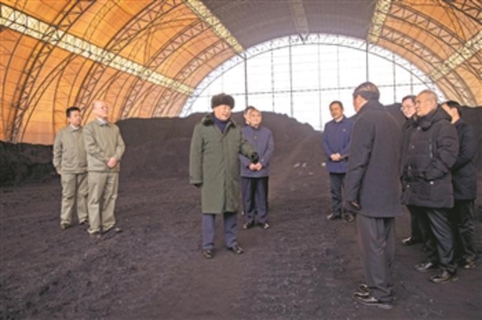 1月26日至27日,中共中央总书记、国家主席、中央军委主席习近平来到山西,看望慰问基层干部群众。这是27日下午,习近平在山西瑞光热电有限责任公司储煤场察看煤场储煤情况。新华社记者 谢环驰 摄
