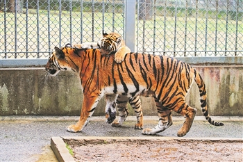 虎年即将到来,江苏苏州上方山森林动物世界2021年9月出生的4只憨态可掬的小华南虎,吸引了众多游客的目光,为新春增添节日气氛。图为:1月26日,在苏州上方山森林动物世界,小华南虎和妈妈嬉戏。新华社记者 李博 摄
