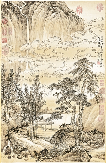 清代女画家陈书(1660~1736),字南楼,号上元弟子,秀水(今浙江嘉兴)人,明末至清代活跃于浙江嘉兴一带,是以书画闻名的钱氏家族的技艺导师和精神领袖,也是钱维城的启蒙者,是一位人物、花鸟、山水皆擅长的全才。《看云对瀑图》(台北“故宫博物院”藏)中,松竹间一人独坐茅亭仰观山崖的飞瀑云岚,画中山石皴染繁复,构图疏密相间,色调淡雅明亮,有一种闺秀画家的清秀气质。