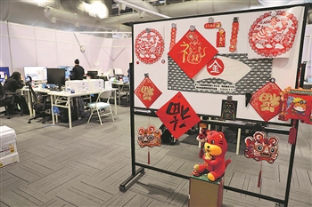 2月2日,主媒体中心的一处媒体工作间内,春节主题的装饰引人注目。