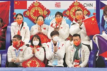 2月4日,首都体育馆内,中国花滑队运动员看台上,队员们手拿国旗和“福”字为运动员加油。