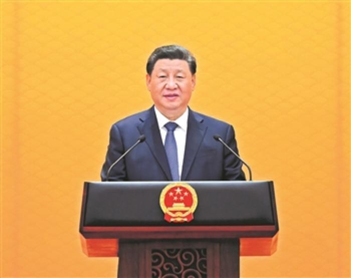 2月5日中午,国家主席习近平和夫人彭丽媛在北京人民大会堂金色大厅举行宴会,欢迎出席北京2022年冬奥会开幕式的国际贵宾。这是习近平在宴会上发表致辞。新华社记者 谢环驰 摄
