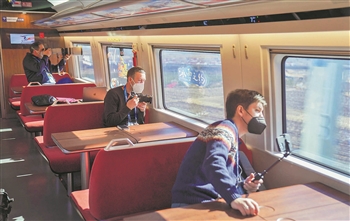 今天天气晴好,车窗外的美丽风光吸引了不少摄影记者拍照。