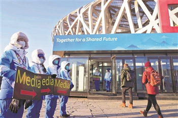 ① 2月4日,“鸟巢”入口,志愿者正手持标识牌为媒体做引导。本报记者 王伟伟 摄