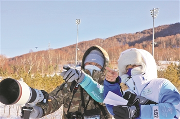 ② 2月5日,张家口崇礼赛区,志愿者为摄影记者介绍越野滑雪的比赛环节。本报记者 王伟伟 摄