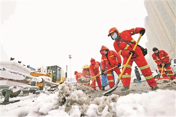 当天凌晨开始,普降大雪,瑶海区组织城管、园林等部门及各街镇开发区成立铲雪除冰应急抢险队,利用铲雪车等大型机械和人工对辖区内立交桥、人行天桥以及240条主次干道开展铲雪除冰工作,以确保交通畅通。本报记者 陈华 本报通讯员 解琛 摄