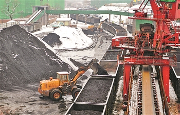 2月7日,在江西九江七里湖站铁路专用线,装载机正在加紧将电煤装运至货物列车上。