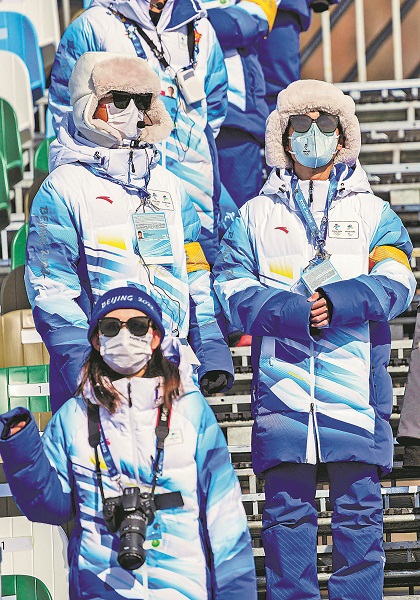 ③ 2月5日,国家越野滑雪中心,“全副武装”的赛场志愿者。本报记者 王伟伟 摄