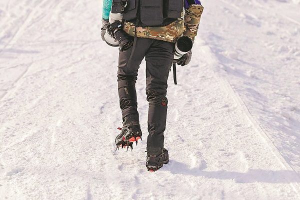 ① 2月7日,张家口崇礼赛区,一位摄影记者正身背三台相机,脚踩冰爪前往拍摄点位。