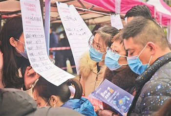 2月8日,在四川省内江市东兴区和平广场,求职者在了解岗位信息。春节假期过后,各地纷纷举办招聘会,为求职者提供丰富的就业选择。