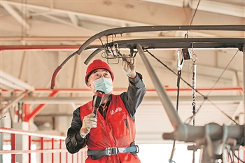 春运以来,随着煤炭、粮食等民生物资运输量激增,薛师傅每天要对电力机车车顶部件进行检查更换和擦拭作业15次,以确保运输安全畅通。(郝鹏)