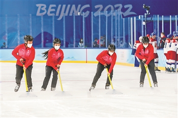① 2月3日,五棵松体育馆内,冰球“雪童”正在清扫冰面。