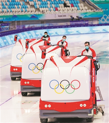 ③ 2月8日,国家速滑馆内,制冰师正驾驶修冰车在浇水修冰。