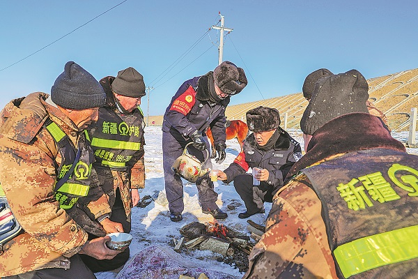 阿富准铁路开通以来,在新疆阿勒泰市巴里巴盖乡活跃着一支由乌鲁木齐铁路公安局奎屯公安处阿勒泰站派出所民警与当地哈萨克族牧民组建的“雪都马背巡逻队”,一匹马、一壶奶茶、一袋包尔萨克(哈萨克族面食)便是整个巡逻队的标配。春运期间,他们克服恶劣天气,坚守在铁路线上,加强对线路的巡查。图为队员在线路旁共进午餐。本报记者 吴铎思 本报通讯员 哈斯巴根 摄