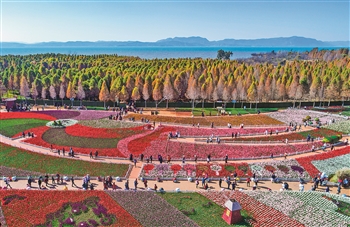 近日,云南昆明捞鱼河湿地公园内23个品种约100万株郁金香进入盛花期,吸引不少市民游客前来赏花。