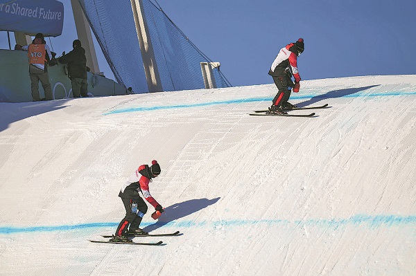 ③ 2月8日,北京首钢大跳台,工作人员正在为雪道补线。
