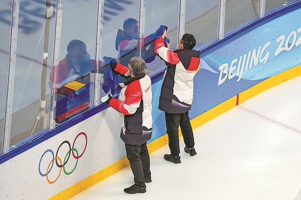 ① 2月6日,五棵松体育馆内,工作人员正在擦拭防护玻璃,方便记者拍照。