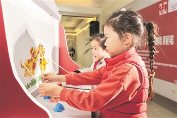2月10日,儿童在活动现场体验皮影戏。