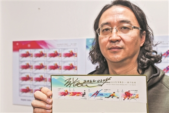 设计师张强展示他设计的北京2022年冬奥会冰上运动纪念邮票(2月8日摄)。