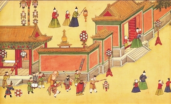 它是一幅设色艳丽的宫廷画,反映了成化二十一年(1485年)明宪宗朱见深元宵节当天在内廷观灯、看戏、放爆竹行乐的热闹场面,是一幅反映宫廷生活的风俗画。该图内容丰富充实,景物繁复,人物众多,疏密得宜,繁而不乱,密而不闷,疏而不散,各个景物表达得十分生动。