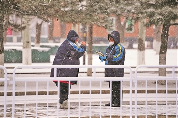 ② 2月13日,北京主媒体中心班车点,来自北京公交的调度员正在雪中工作。