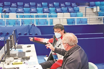 ① 2月3日,冰壶比赛现场,来自中建一局的工程师孙德远正在和世界冰壶联合会制冰专家查看制冰机组运行情况。