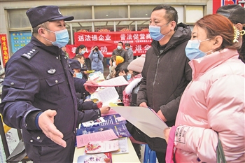 2月16日,江苏省镇江市七里甸派出所民警在向市民宣讲防电信与金融诈骗的相关知识。当日,七里甸街道联合法院、公安等部门开展“送法进企业 普法促营商”活动,来到五里社区辖区的小商品市场,向市民和经营户宣讲法律法规等知识。本报通讯员 石玉成 摄