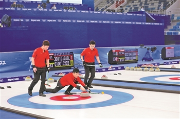 中国冰壶男队正在比赛中。本报记者 曲欣悦 摄