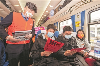 2月18日,列车员为旅客发放企业招聘信息资料。