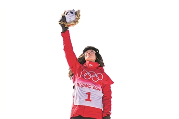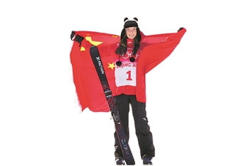 ① 2月18日,夺冠后的谷爱凌。本报记者王伟伟 摄