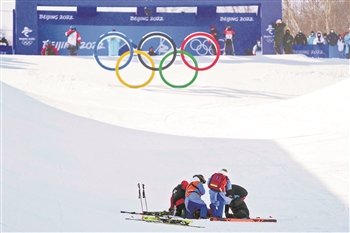 2月18日,自由式滑雪女子U型场地技巧决赛中,中国队选手张可欣受伤后接受医疗救助。新华社记者 王昊飞 摄