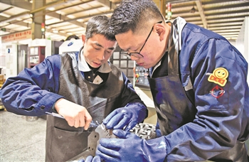 2月21日,在安徽省合肥市庐阳经开区合肥力威汽车油泵有限公司生产车间,“质量标兵”(图左)向实习生传授数控机床操作、产品质量标准等技术。庐阳经开区鼓励企业以奖励机制、劳动竞赛、“质量标兵”在生产一线指导新员工等办法,培育“蓝领型”实用技能人才,助力企业高质量发展。