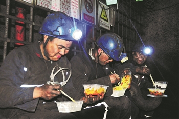 2月16日12时,刚走进中国华能华亭煤业公司东峡煤矿综采队37221-1工作面上口,就闻到一股饭菜的香味。生产一班职工正在津津有味地吃盒饭。从今年元月起,该矿统一为井下综采一线职工配送班中餐,大家再也不用吃冷馍了。白银宝 张鹏 摄