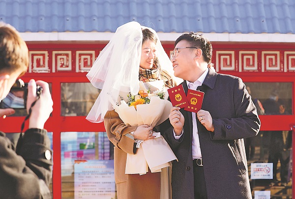 2月22日下午,一对新人在北京市东城区民政局婚姻登记处登记结婚后,持结婚证合影留念。当天是2022年2月22日,农历正月廿二,星期二。因“2”与“爱”谐音,不少新人选择在这天登记结婚。本报记者 吴凡 摄