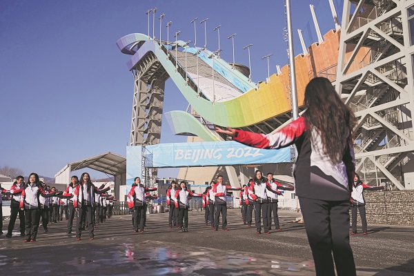2021年12月30日,北京首钢滑雪大跳台的工作人员正在演绎《一起向未来》手势舞。