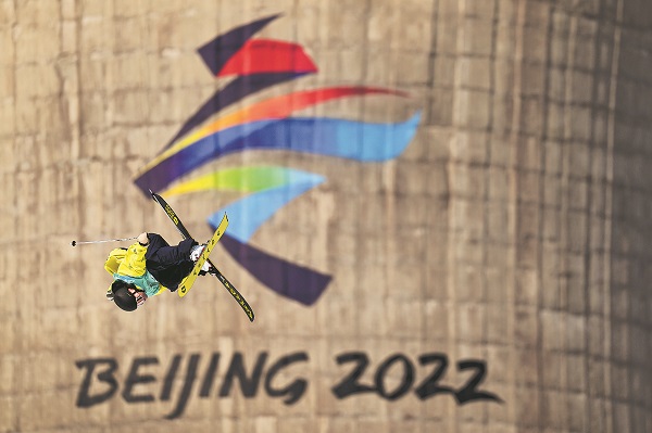 2022年2月9日,北京首钢滑雪大跳台,北京冬奥会自由式滑雪男子大跳台决赛上,一名选手高高跃起。