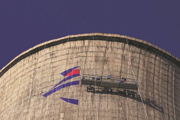 2021年12月30日,与北京首钢滑雪大跳台相邻的一个冷却塔上,工作人员正在粉刷北京冬奥会会徽。
