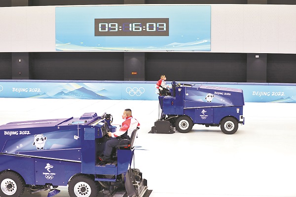 2022年2月4日,北京冬奥会短道速滑训练馆,制冰师刘永亮与同事正在浇冰,为即将训练的运动员做准备。