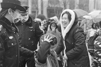 2月18日,山东省滕州市公安局北辛派出所民警冒着风雪,在城区北辛小学护送学生放学。当日,该市普降雨雪,当地公安机关为确保陆续开学的中小学校师生安全,提前启动应对恶劣天气工作预案,开启“护学岗”勤务模式,全力守好师生上下学出行安全。季龙/人民图片
