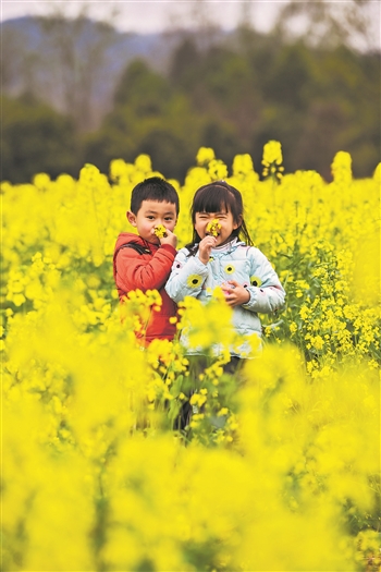图④:小游客在四川省崇州市道明镇的油菜花田中玩耍。新华社记者 王曦 摄
