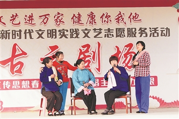 近日,山东莘县古云镇依托镇、村两级新时代文明实践阵地,组织新时代文明实践文艺志愿者开展了一系列文化惠民活动。豫剧《朝阳沟》等精彩表演,引来群众连声喝彩。(徐海兰摄)