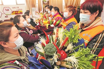 3月3日,江苏省连云港市连云区墟沟街道桃园社区举办“三八妇女节——巾帼展芳华、绽放新时代”创意插花活动,邀请社区环卫女工一起制作“蔬果手捧花”。用鲜艳的水果和各色蔬菜做成的“蔬果手捧花”,既美观又可食用,让环卫女工惊喜不已。